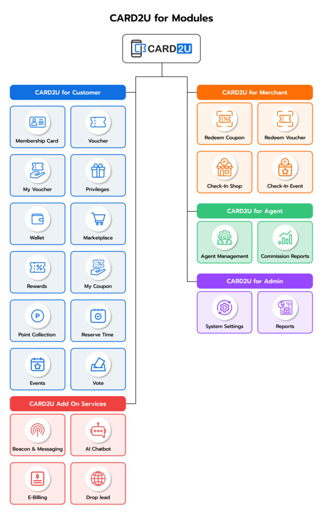 CARD2U ช่วยเพิ่มช่องทางการขายออนไลน์ผ่านทาง LINE OA โปรโมทสินค้า/ บริการ ให้ถึงลูกค้ากลุ่มเป้าหมาย วิเคราะห์พฤติกรรมการซื้อของลูกค้าเพื่อกำหนดกลยุทธ์ จัดทำ กิจกรรมการตลาดเพื่อกระตุ้นการขายและสร้างความสัมพันธ์ที่ดีกับลูกค้าได้อย่าง มีประสิทธิภาพ ด้วยฟังก์ชันที่ครอบคลุมทั้งการส่งข้อมูล & โปรโมชั่นถึงลูกค้ากลุ่ม เป้าหมาย การสะสมคะแนน การแลกคะแนน การสร้างและขาย Voucher การเก็บข้อมูล ลูกค้าเพื่อใช้วิเคราะห์ การเชื่อมต่อกับระบบ Marketplace รวมทั้งรองรับการชำระเงิน ได้ทั้ง Online และ Offline โดยมีระบบหลังบ้านที่ช่วยให้สามารถจัดการเรื่องต่าง ๆ ได้ง่ายและสะดวกสบาย