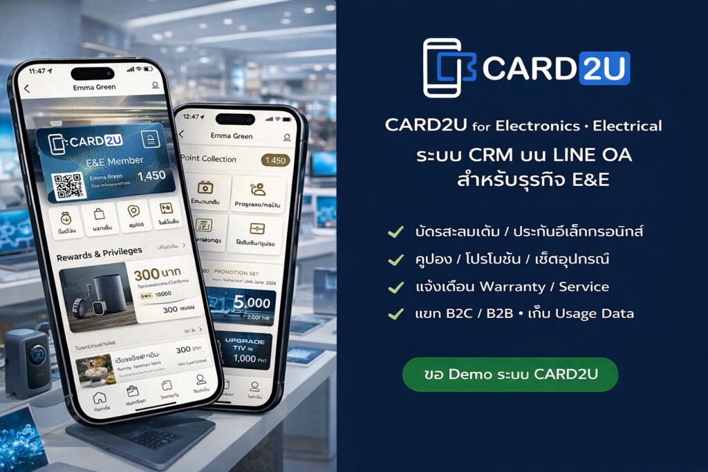 CARD2U สามารถปรับหน้าตา/เมนู/แคมเปญให้เหมาะกับแต่ละอุตสาหกรรม เช่น ร้านอาหาร, Electronics, รถยนต์/EV, สปา/โรงแรม, สุขภาพ/เวลเนส, โซลาร์